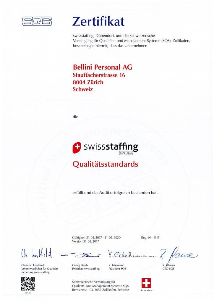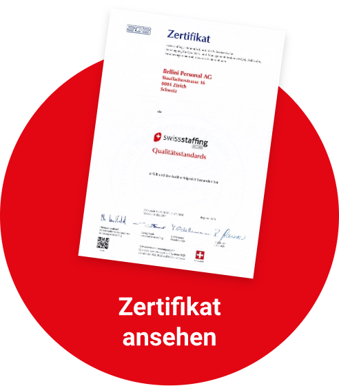 Official, periodic audits confirm that we work professionally in all areas. Our quality management is certified according to the strict requirements of swissstaffing SQS – a seal of approval that underlines our commitment to quality and reliability.